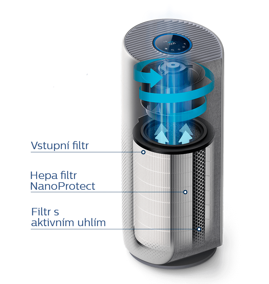 Odstraní ze vzduchu 99,9 % znečistění jako jsou smogové částice, viry, bakterie, prach a pyl, a to díky 3úrovňovému filtračnímu systému s kvalitním HEPA filtrem NanoProtect
